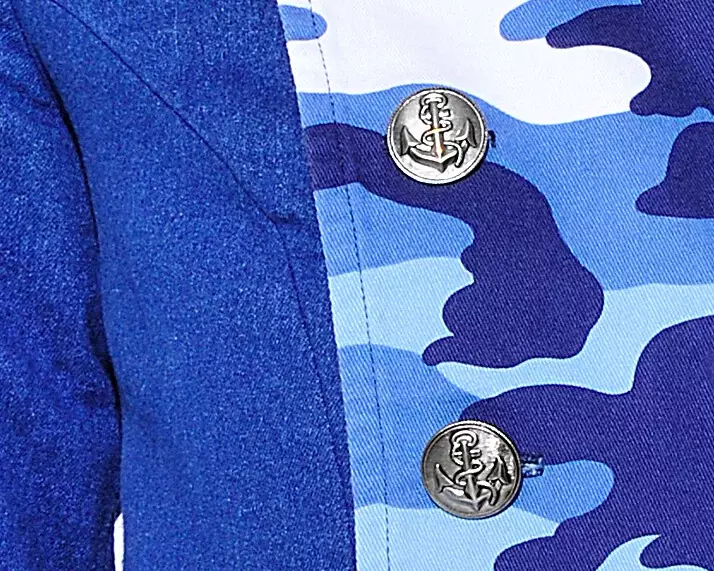 KAPTAN erinnert mit Paspeltaschen und Umlegekragen an eine Bikerjacke – und ist doch viel mehr. Aus feiner, blauer Denim-Jeans designt, zieht vor allem die Vorderseite der Jacke alle Blicke auf sich. Diese besteht aus einem abnehmbaren Add-on im blau-weißen Camouflage-Muster aus hochwertiger Baumwolle. Das auffällige Muster wiederholt sich im Kragen und lässt sich ebenfalls – ergänzt durch blauen Satin – im Innenfutter entdecken. Verschlossen wird die Jacke durch einen Reißverschluss. Die silbernen Knöpfe mit Ankermuster vollenden diese feminine Adaption einer Bikerjacke.